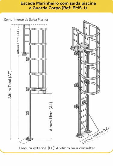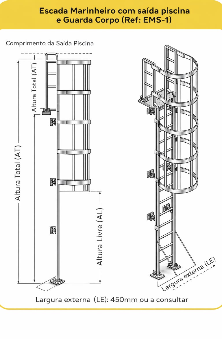 Indicada para ambientes industriais, comerciais, condomínios, clubes e áreas técnicas, a escada EMS-1 alia segurança, resistência e funcionalidade, sendo uma solução eficiente para acessos verticais com proteção.